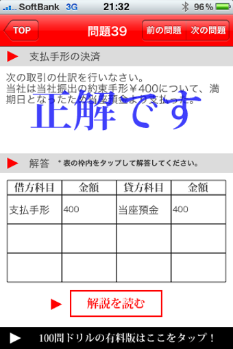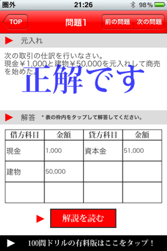 問題画面では、画面の上半分に問いが表示されるので下半分の解答欄に答えを入力します。数字はキーボードで入力し、勘定科目などの文字はセレクトリストから選びます。操作は楽ですが、勘定科目を暗記しなくても解けるので多少張り合いがないかもしれません。「解答を確定する」をタップすると、「正解です」「不正解です」と表示されて解説が表示されます。解説はLEC講師によって作成されており、読みやすいように簡潔にまとまっています。