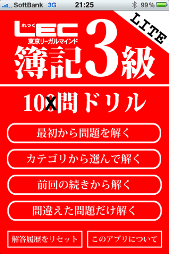LEC簿記3級100問ドリル LITEは、株式会社 東京リーガルマインド(LEC)の公式アプリで、同社出版の書籍「10日で合格るぞ!日商簿記 3級光速マスター問題集」と連動しています。アプリの問題は、書籍と同じように10カテゴリーに分かれており、LITE版では各カテゴリーから1問ずつ出題されます。